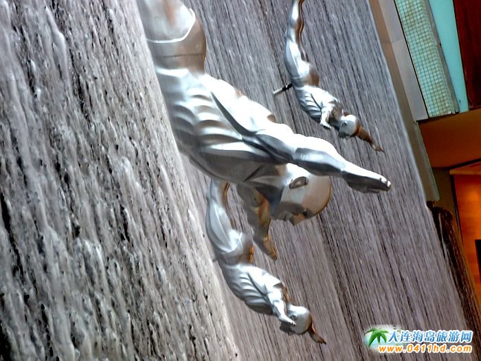 迪拜購物中心中的人工瀑布景觀,構成了現代商業空間的新構思、新發展,購物中心的中庭空間歷來是設計師精心設計的地方,中庭空間中設置瀑布景觀將中庭設計帶來了新的思路。每一件雕塑作品都是一個高臺跳水的動作,并且動作相同,整齊劃一,吸引了不少游客駐足拍照。