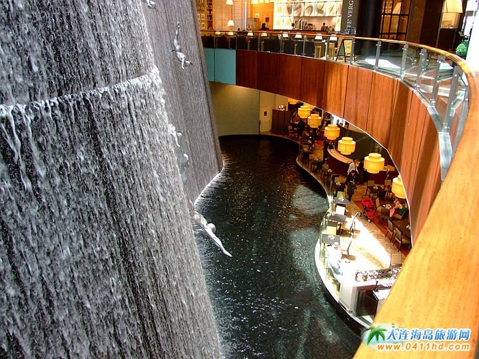 迪拜Mall人造瀑布高度為商城的三樓高度,一排跳水運動員的塑像,以一個俯沖跳水的動作,自上而下的排列著,在不息的流水中,栩栩如生,具有很強的動感。