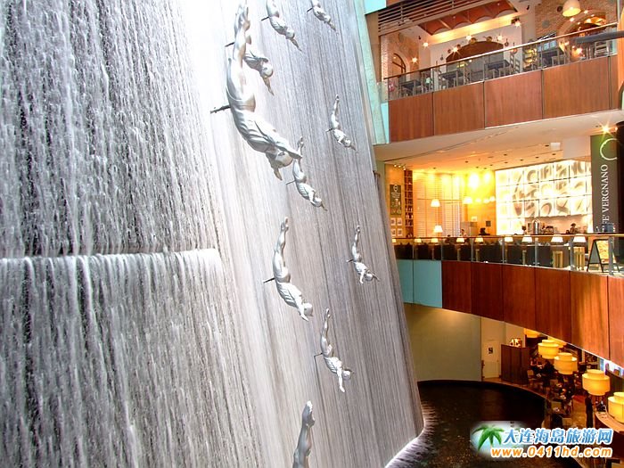 迪拜Mall人造瀑布高度為商城的三樓高度,一排跳水運(yùn)動(dòng)員的塑像,以一個(gè)俯沖跳水的動(dòng)作,自上而下的排列著,在不息的流水中,栩栩如生,具有很強(qiáng)的動(dòng)感。