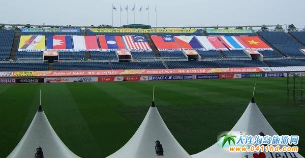韓國濟州島西歸浦2002年世界杯體育場位于位于濟州道西歸浦市,整個足球場占地面積134122平方米,建筑面積22188平方米,足球場1999年動工興建的,2001年12月9日正式建成,濟州島西歸浦體育場總投資近一億美元。場地長117米,寬78米,觀眾席42256個。雖然投資規模是韓國新建的世界杯足球場中最小的,但卻與漢城世界杯足球場一起被公認為韓國最好的兩座足球場。