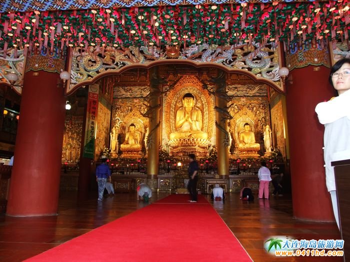 韓國(guó)濟(jì)州島藥泉寺法堂內(nèi)部有韓國(guó)境內(nèi)最高5m的主佛毘盧舍那佛,供奉在高達(dá)4m的座臺(tái)上。左右兩邊的墻壁上有巨大的幀畫雕刻。法堂前的鐘閣掛有重達(dá)18噸的梵鐘。除了2,652㎡ 大的大寂光殿和3層大小的廖舍,還有三星閣、舍利塔。不僅有眾多佛教信徒前來,而且每年都吸引了許多游客前來此地許愿。