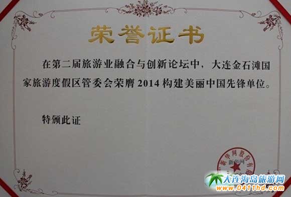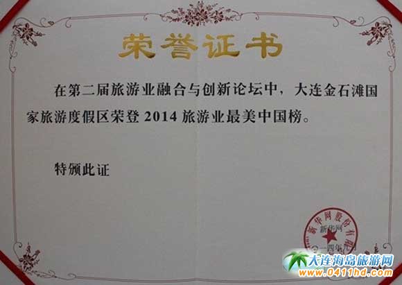 9月13日,第二屆旅游業融合與創新論壇暨2014最美中國榜發布會在北京舉行。大連金石灘國家旅游度假區榮登2014旅游業最美中國榜;被評為最美中國生態旅游、人文(休閑)旅游目的地景區。大連金石灘國家旅游度假區管委會榮膺2014構建最美中國先鋒單位。