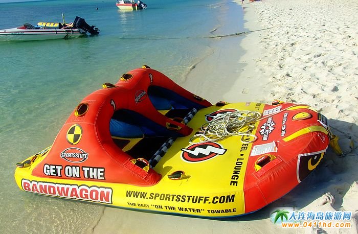 在眾多的塞班島旅游娛樂項目,香蕉船是最受歡迎的一個活動,一艘飛馳的大馬力快艇拖曳著一條類似香蕉形狀的橡皮船,幾個人坐在上面,在藍天碧海之間穿梭,驚險刺激,將歡快化作尖叫暢快的釋放,不僅僅考驗你的膽量同時也在考驗你的肺活量。