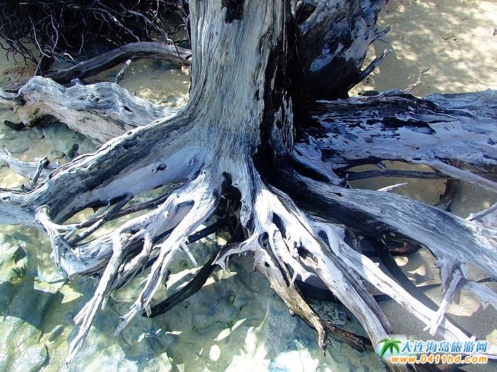 軍艦島圖片-橫亙于海邊的樹干任其歲月將其打磨