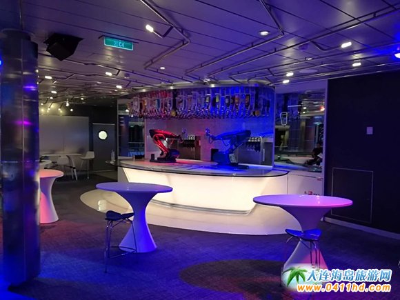 另外,“未來郵輪”量子號的另一標志應屬位于5層中間的機器人酒吧。機器人只有一只調酒的機械手臂,座在弧形的桌子上,棚頂吊有各色酒品。客人只需點好酒水和飲料,機械手臂就開始調制,機器人輕盈地揮舞著手臂,給人一種完全不同的視覺體驗。
