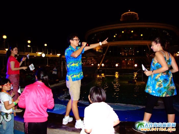 "郵輪上會讓你時時的激情四射。甲板派對是由"海洋神話號"郵輪娛樂活動部經理JEFFREY先生及娛樂部員工主持,音樂來自DYNAMICDUO,活動的時間是在晚上10:45至午夜,地點在9層露天泳池畔,記住,不要太興奮,不要太狂熱,這里沒有出租車。