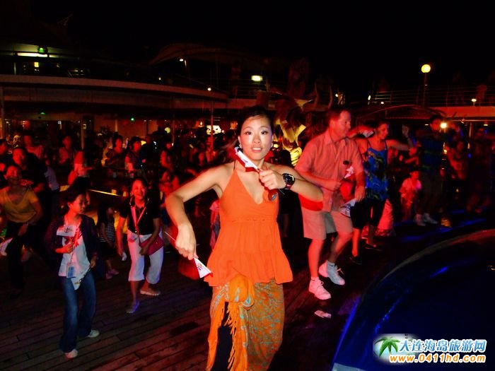 "郵輪上會讓你時時的激情四射。甲板派對是由"海洋神話號"郵輪娛樂活動部經理JEFFREY先生及娛樂部員工主持,音樂來自DYNAMICDUO,活動的時間是在晚上10:45至午夜,地點在9層露天泳池畔,記住,不要太興奮,不要太狂熱,這里沒有出租車。